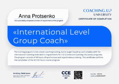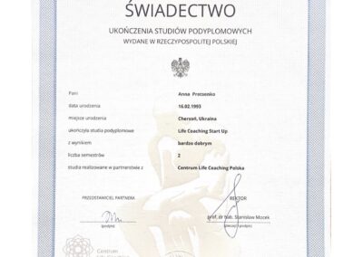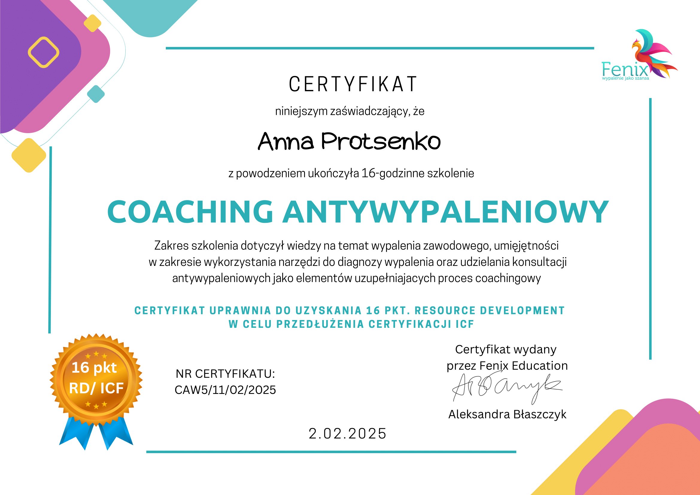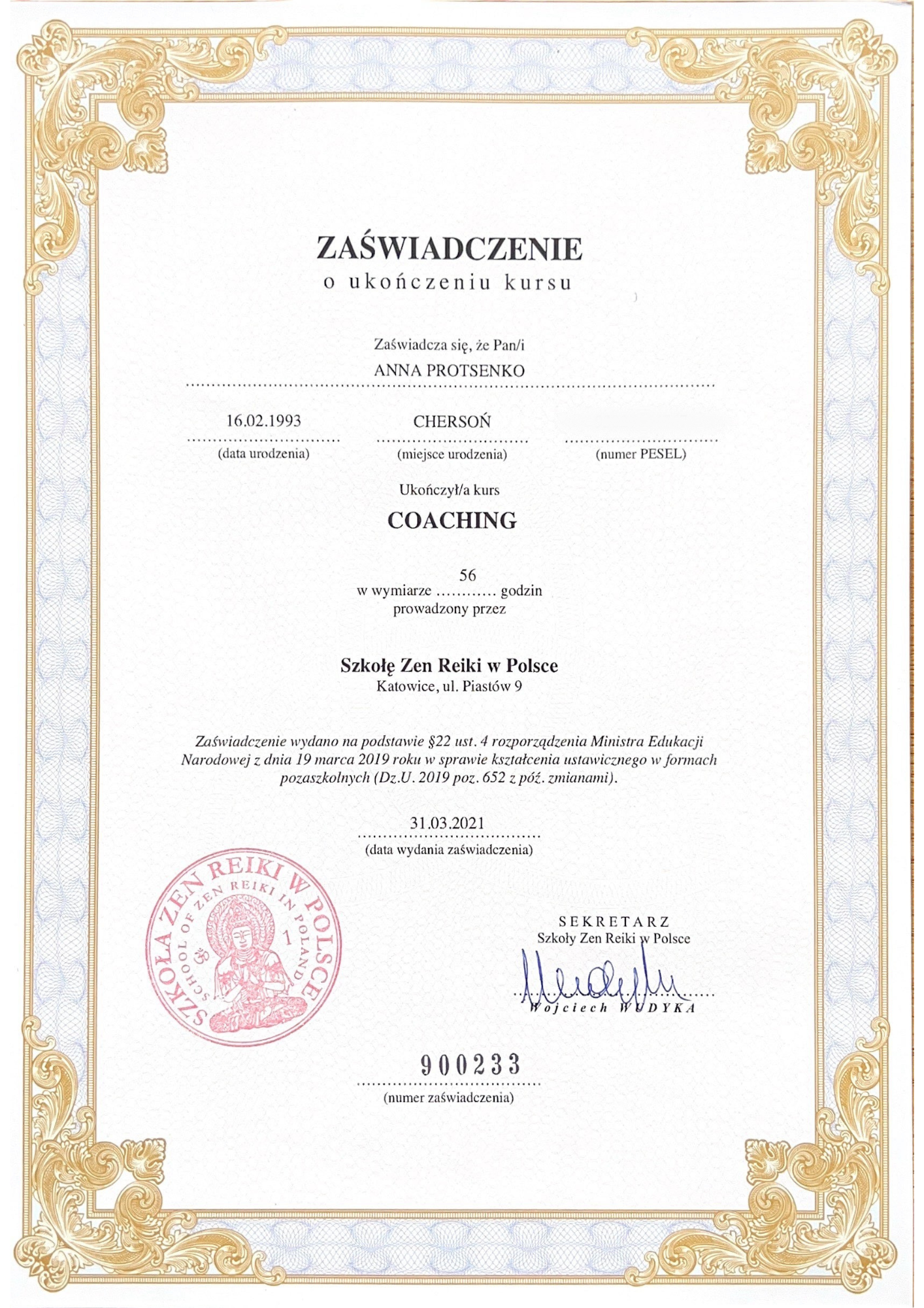 Jestem certyfikowaną coachką wg standardów ICF i AC, trenerką uważności i świadomego odpoczynku oraz przedsiębiorczynią – właścicielką holistic wellness studia MASSAYA w Warszawie.